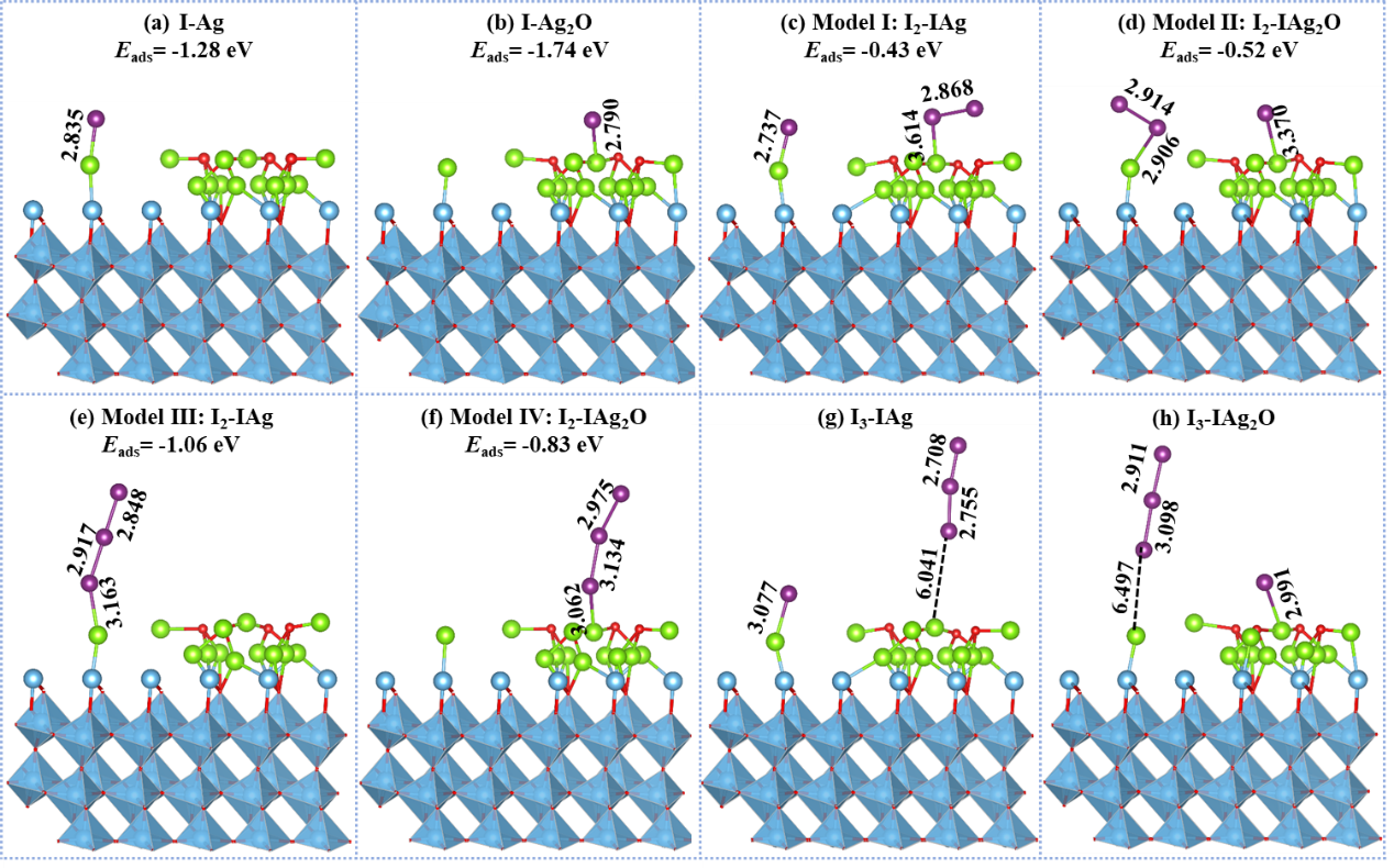 Figure 2. Optimized configurations of various iodine species adsorbed on adsorbent: (a-b) Adsorption of I- on AT nanocomposites; (c-f) Adsorption of I2 on I-AT nanocomposites; (g-h) Adsorption of I3- on I-AT nanocomposites.